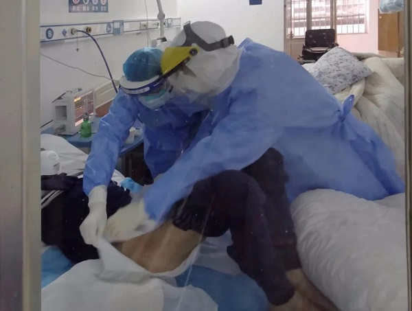 這位患者今年62歲,已經病了好幾個月了,最初在鄉鎮衛生院治療,后來檢測出來感染了新型冠狀病毒肺炎。縣醫院接管他的時候,病情已經極其危重,大小便失禁,床上臊臭氣熏人,患者全身骨瘦如柴,動則喘氣,吃不下東西。